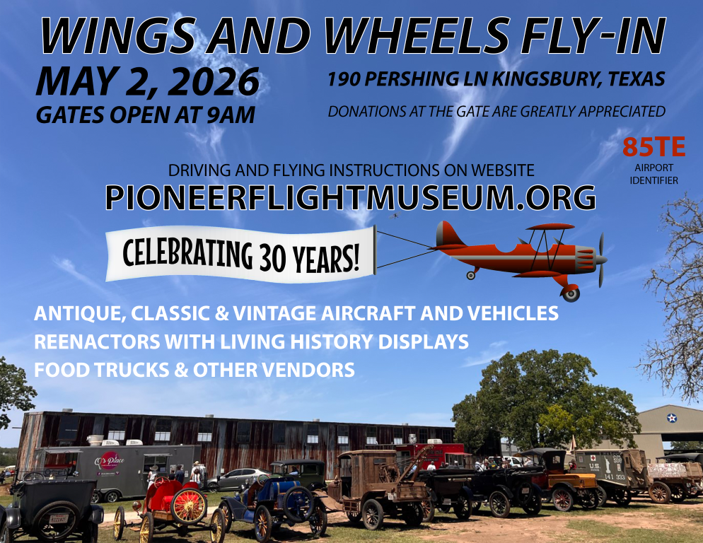 The Pioneer Flight Museum is located at Old Kingsbury Aerodrome in Kingsbury, Texas. Tours are available 9:00 am-12:00 pm, and 1:00 pm-4:00 pm most weekdays and weekends. Sometimes we’re tied up elsewhere, so always best to call or email ahead to ensure somebody will be available to let you in and/or show you around.